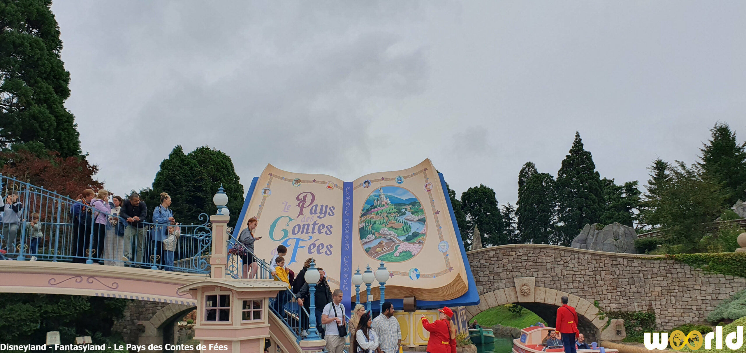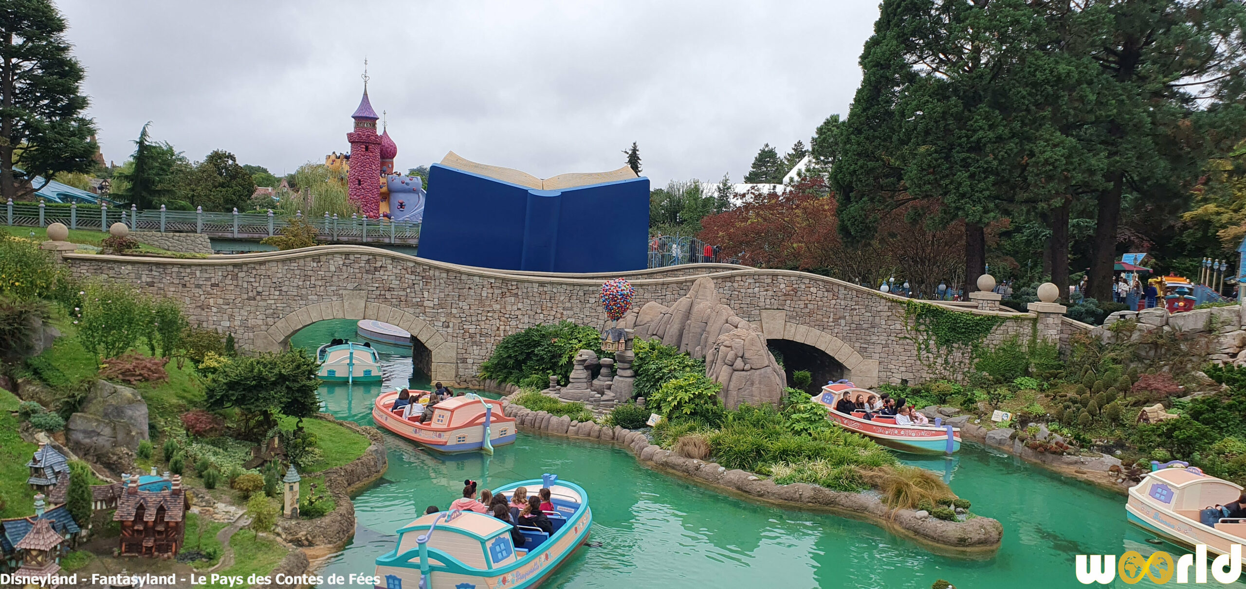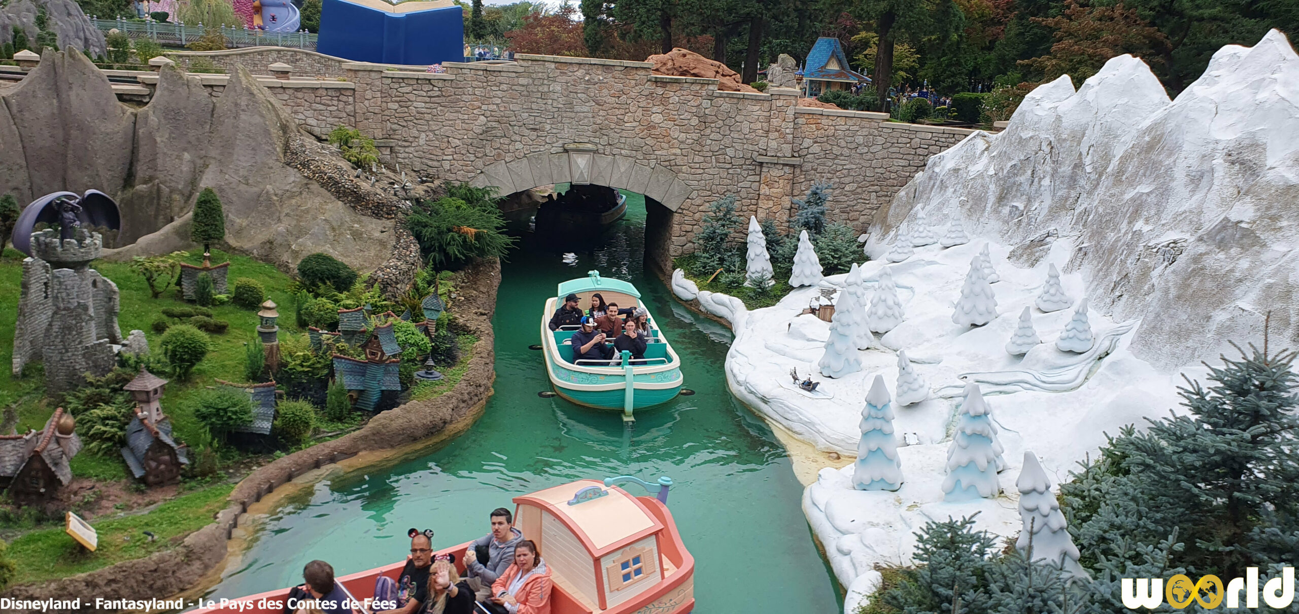 Les visiteurs embarquent à bord de petites gondoles pastel et glissent paisiblement sur une rivière sinueuse bordée de collines fleuries et de ponts miniatures. Au fil de l’eau, ils découvrent de somptueuses maquettes miniaturisées représentant les lieux emblématiques des contes :