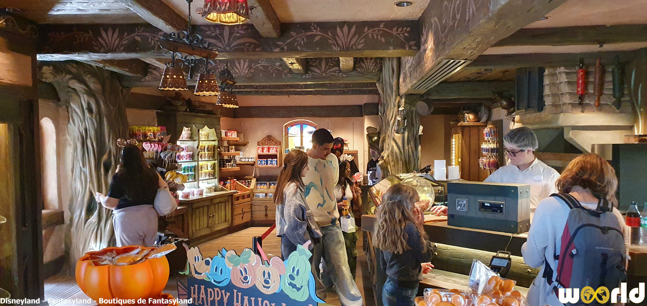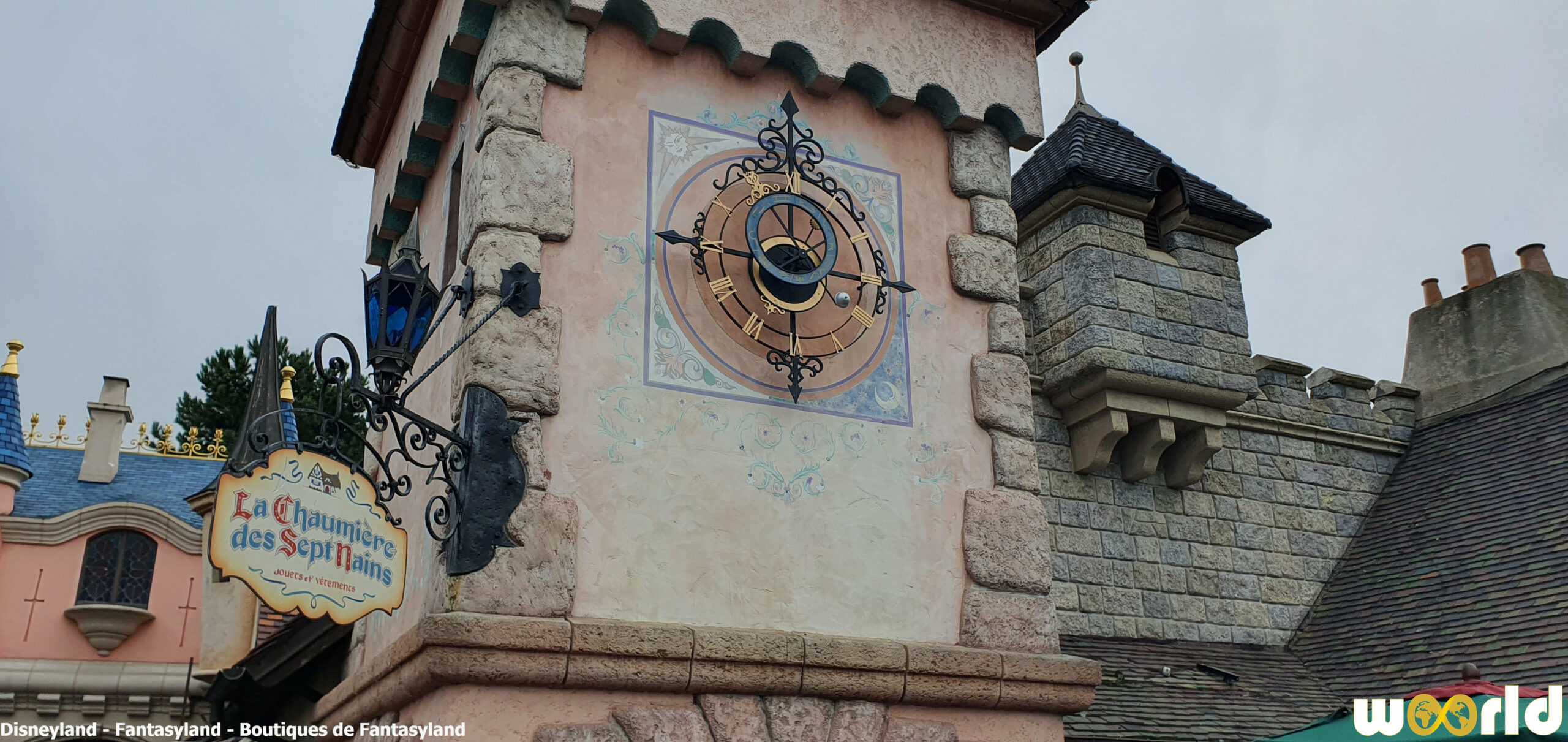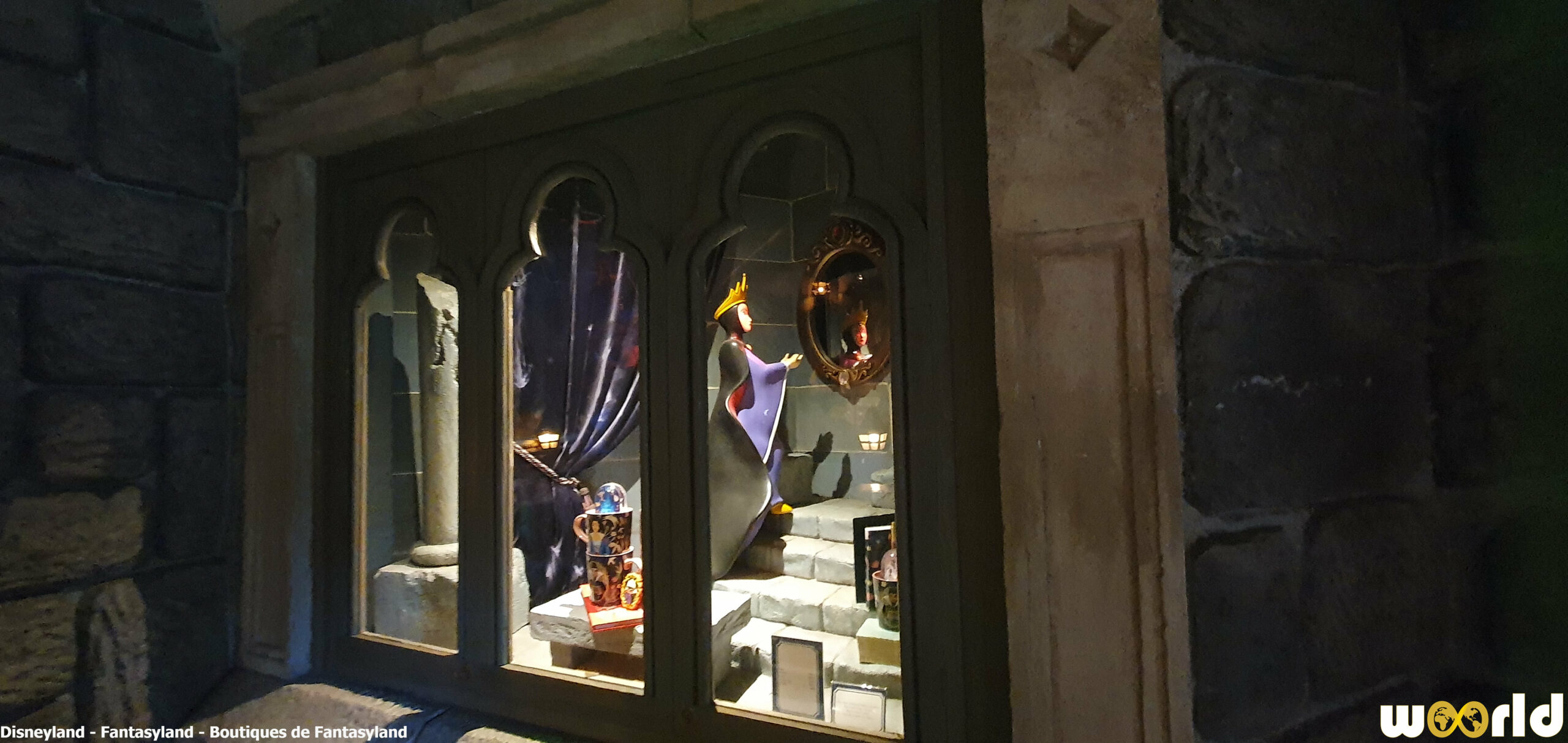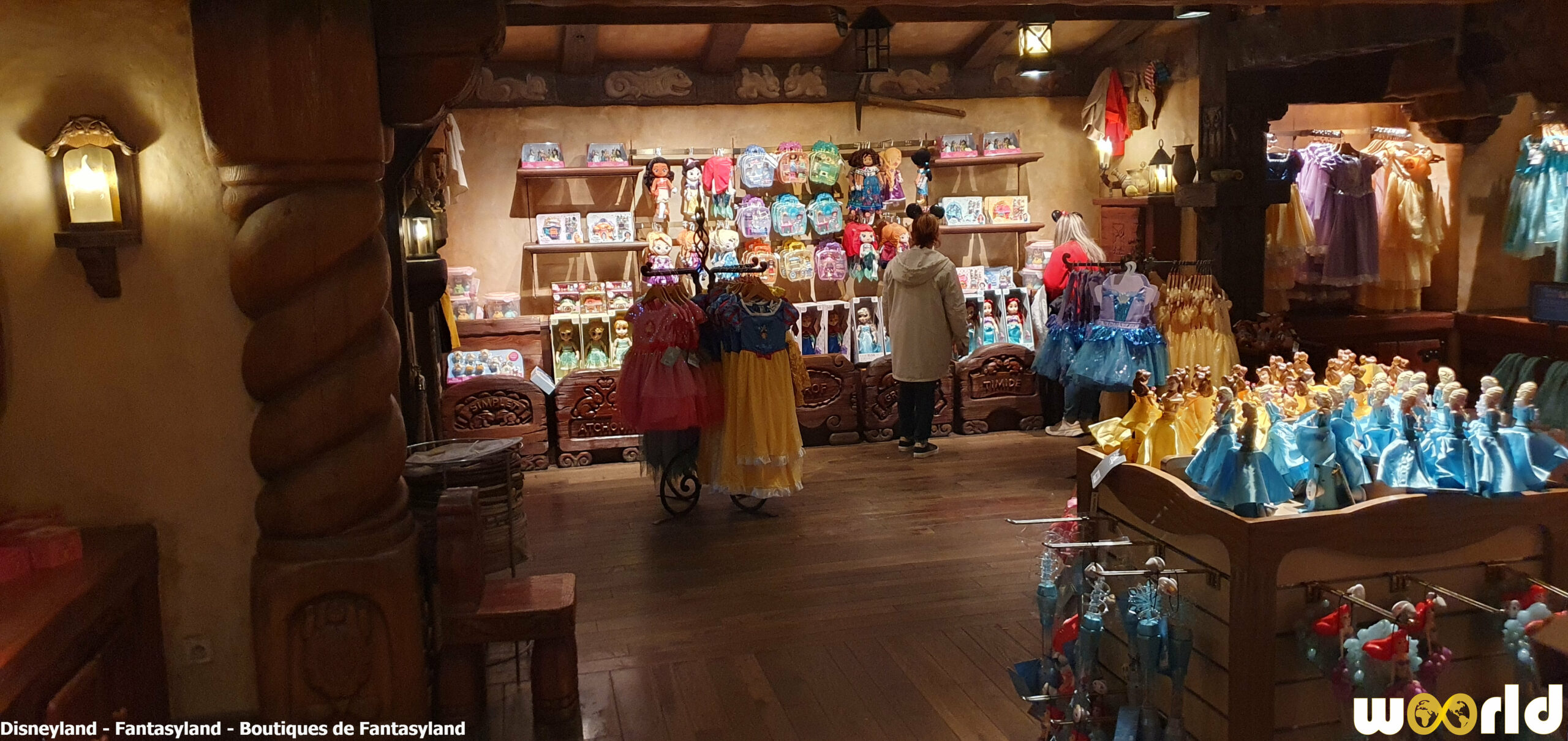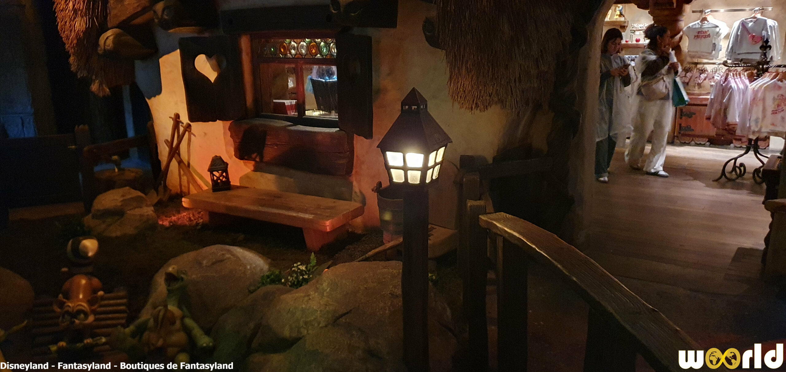 La Chaumière des Sept Nains : boutique emblématique située à la sortie de Blanche-Neige et les Sept Nains. On y trouve des articles classiques, peluches, figurines et accessoires inspirés des princesses Disney. Son intérieur de bois sculpté et son toit de chaume évoquent parfaitement la chaumière du conte.
